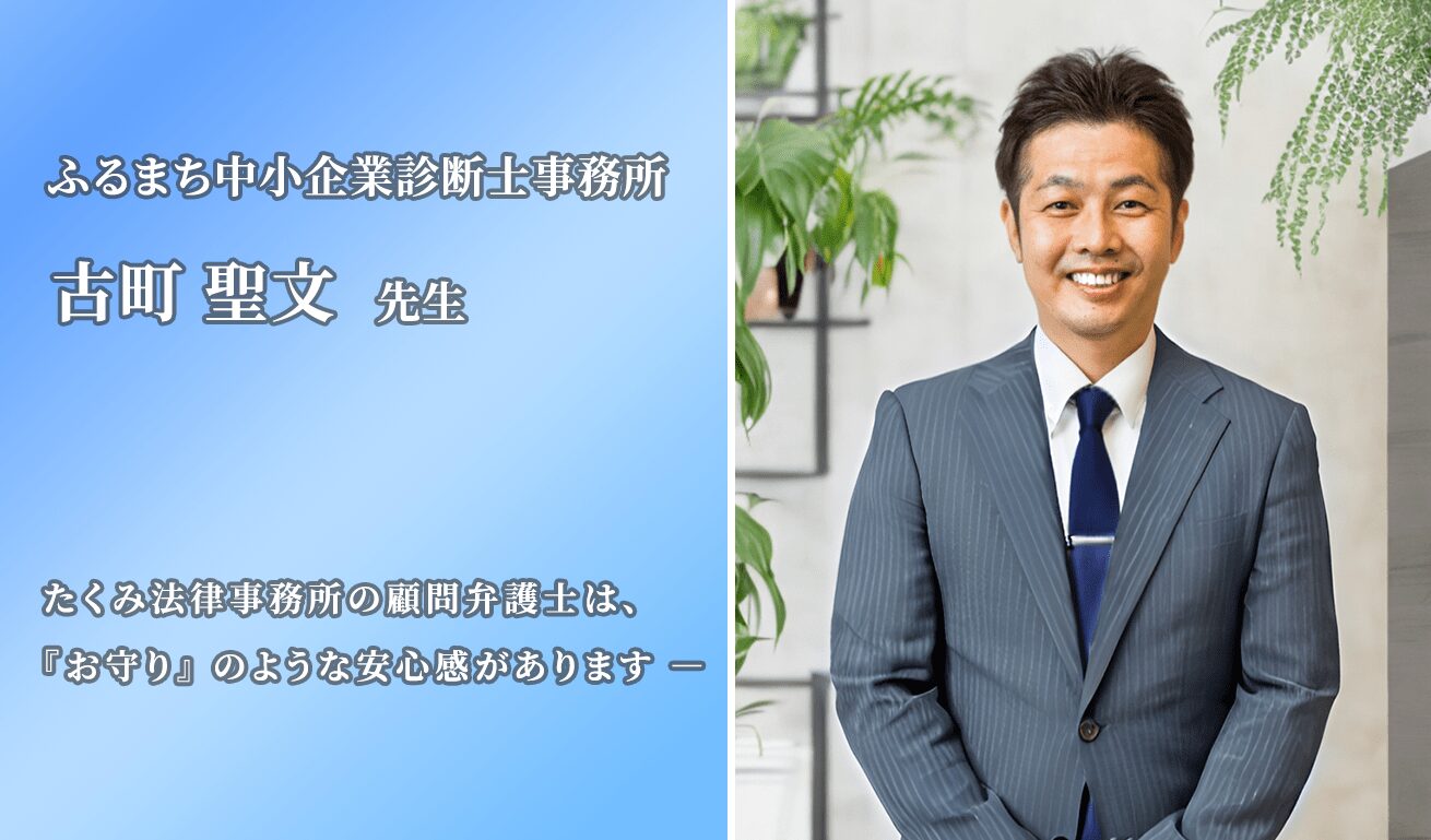 当事務所の顧問先「ふるまち中小企業診断士事務所」古町聖文先生に、たくみ法律事務所の顧問弁護士を3年程ご活用いただいた感想を伺いました。